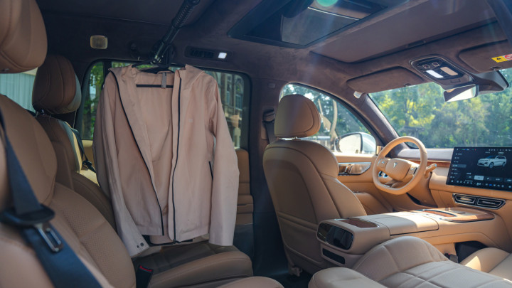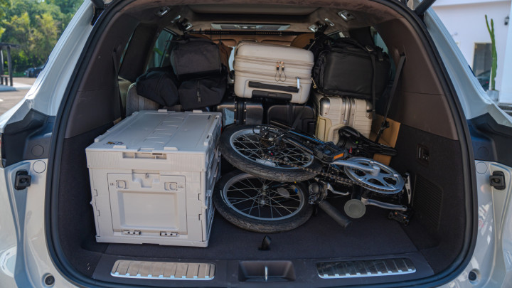 更让人惊喜的是,当第三排座椅放倒后,后备箱容积可以达到1392L,意味着四口之家的长途旅行,也完全不用担心行李问题。这次深蓝S09装下了三个人的所有摄影装备、行李,我们甚至尝试了把折叠自行车放了进去,简直轻轻松松。我们还想到了其实可以对第三排做合适的改装,增加一根横杆,这样第三排下面放行李,上面挂衣服,出行各种场景都能应对了。