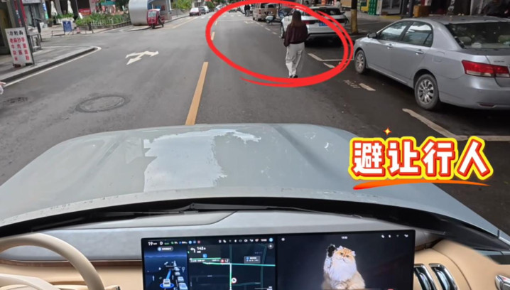 首先,在人流量比较密集的路段,车速比较低,但小朋友突然从路边冲出来这样的突发状况依然有可能会发生,而这套ADS 4对于路边行人、障碍物的识别足够迅速精确,反应速度也在线,前方有行人的时候,它会轻轻的往左边绕行,然后再往前走,可以很好的保护行人安全,同时也能降低重刹次数。