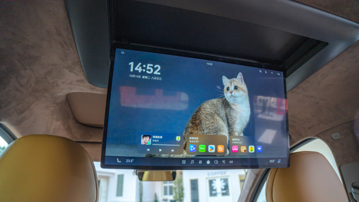 并且,二排的配置也真的可以当作小客厅了,小桌板、21.4英寸的屏幕,加上一个超大的移动岛台,这跟我家客厅有啥区别。移动岛台下面的冰箱里,很适合放些零食饮料,可以说深蓝S09把零食柜都备好了。